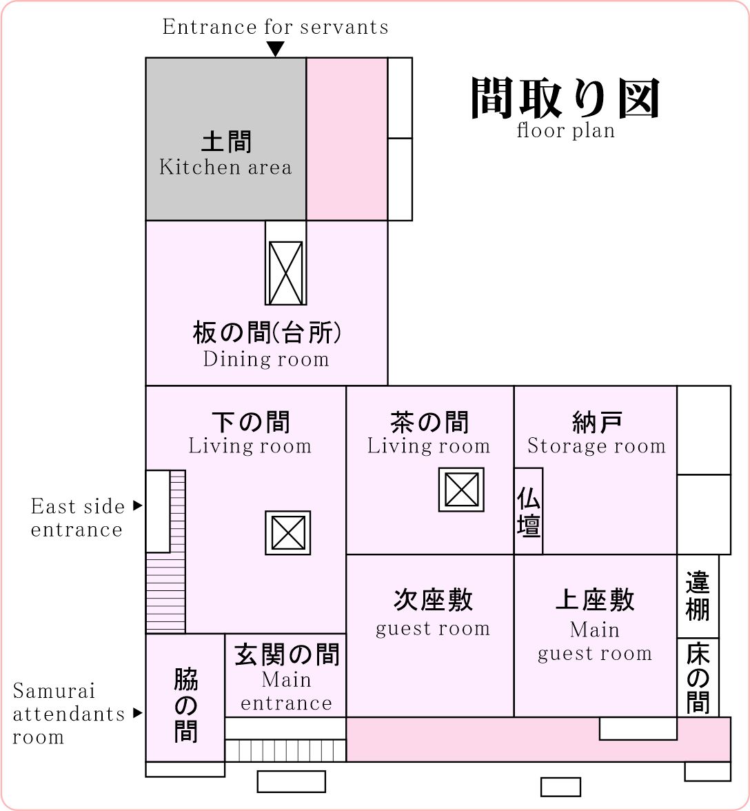 間口16間(約29m)、奥行き30間(約55m)の敷地のうち、通りに面した表側は板塀で、その他はヒバ垣であったと考えられ、東側の屋敷境には石組溝があります。茅葺き曲り家の主屋は、薬医門をくぐり抜けた正面やや西寄りに来客用の玄関『式台(しきだい)』があり、武士が出入りしました。位の高い来客者はこの玄関ではなく、薬医門をくぐった右手、塀重門(へいじゅうもん)という板塀に設けられた潜り門を通り、直接、上座敷(かみざしき)へ上がることもありました。家人は、主屋東側の玄関から出入りしていました。